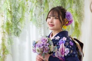落ち着いたスタジオ撮影で、振袖姿の美しさや大人になった表情を、